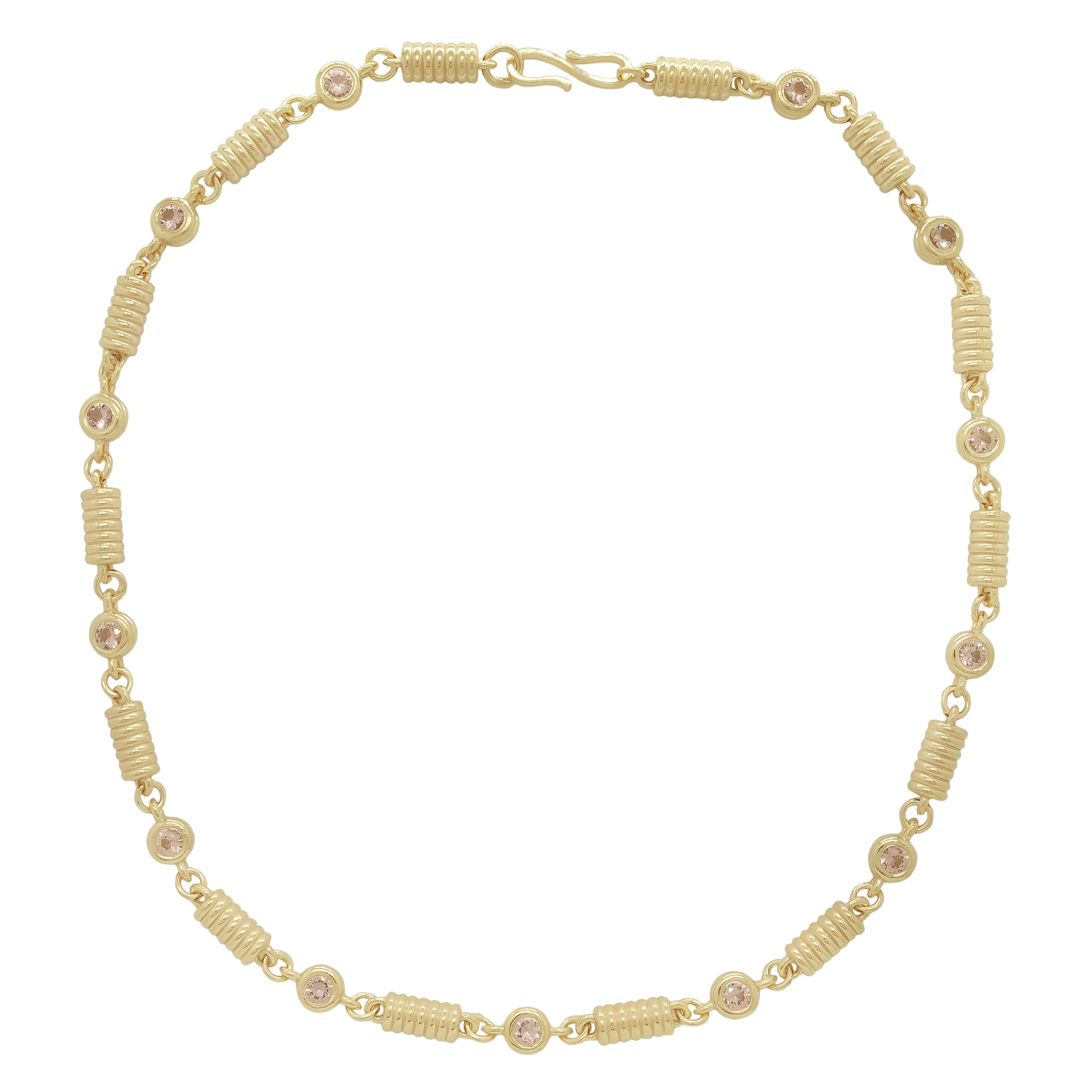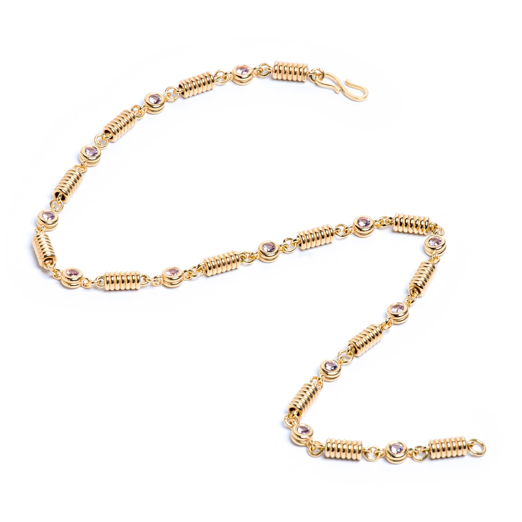Anchor Link Morganite & Hessonite Garnet Chain Necklace is made in 14k yellow gold, set with 4 mm round morganites and hessonite garnets, creating a beautiful color play as the necklace moves. The clasp is our own ORMAN S-design, allowing the necklace to be versatile as it can be connected to other chains and necklace.