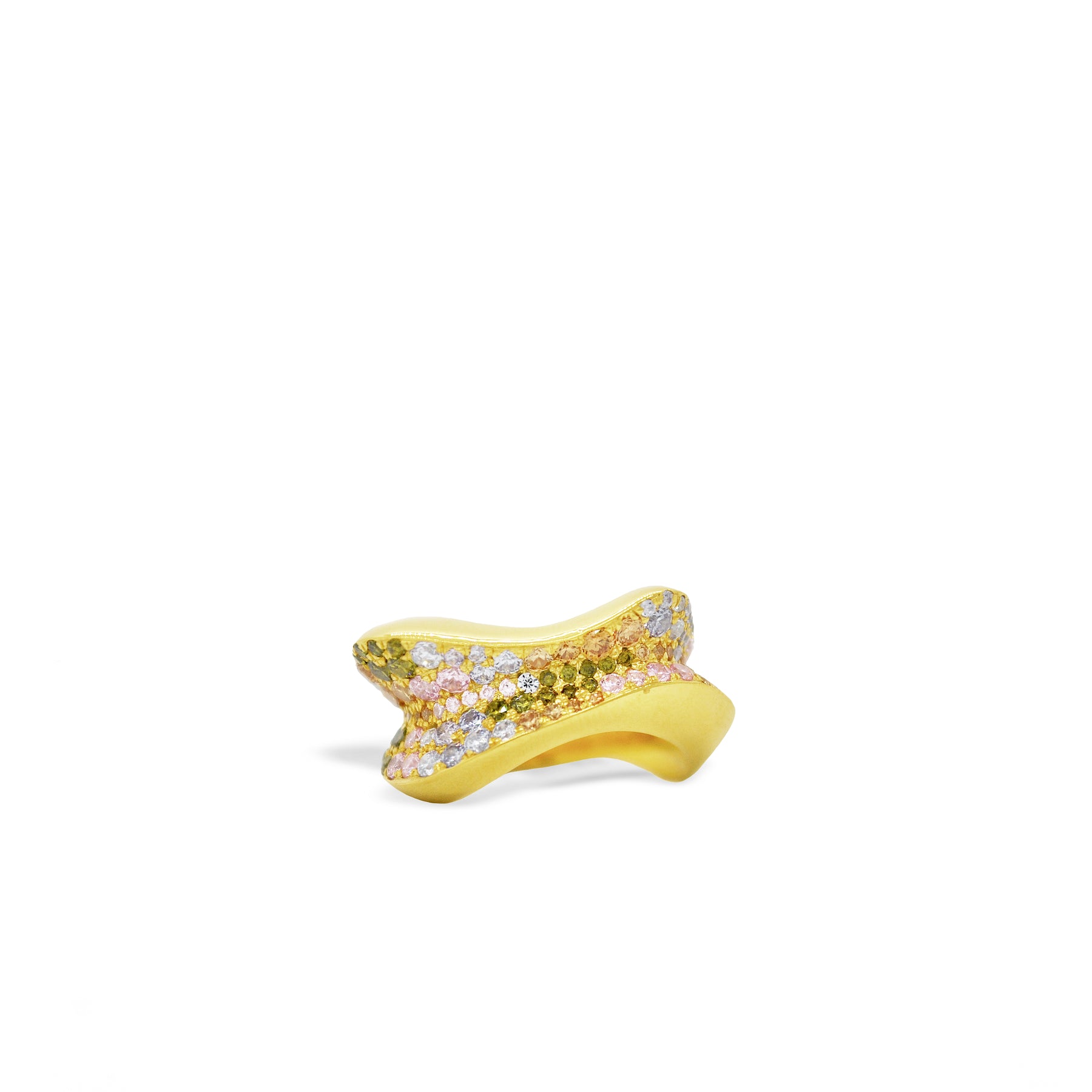 Calm Seas Sapphire Ring is made in 14k yellow gold. The ring is set with pink, blue, green and orange sapphires, total of ~1.35 ctw