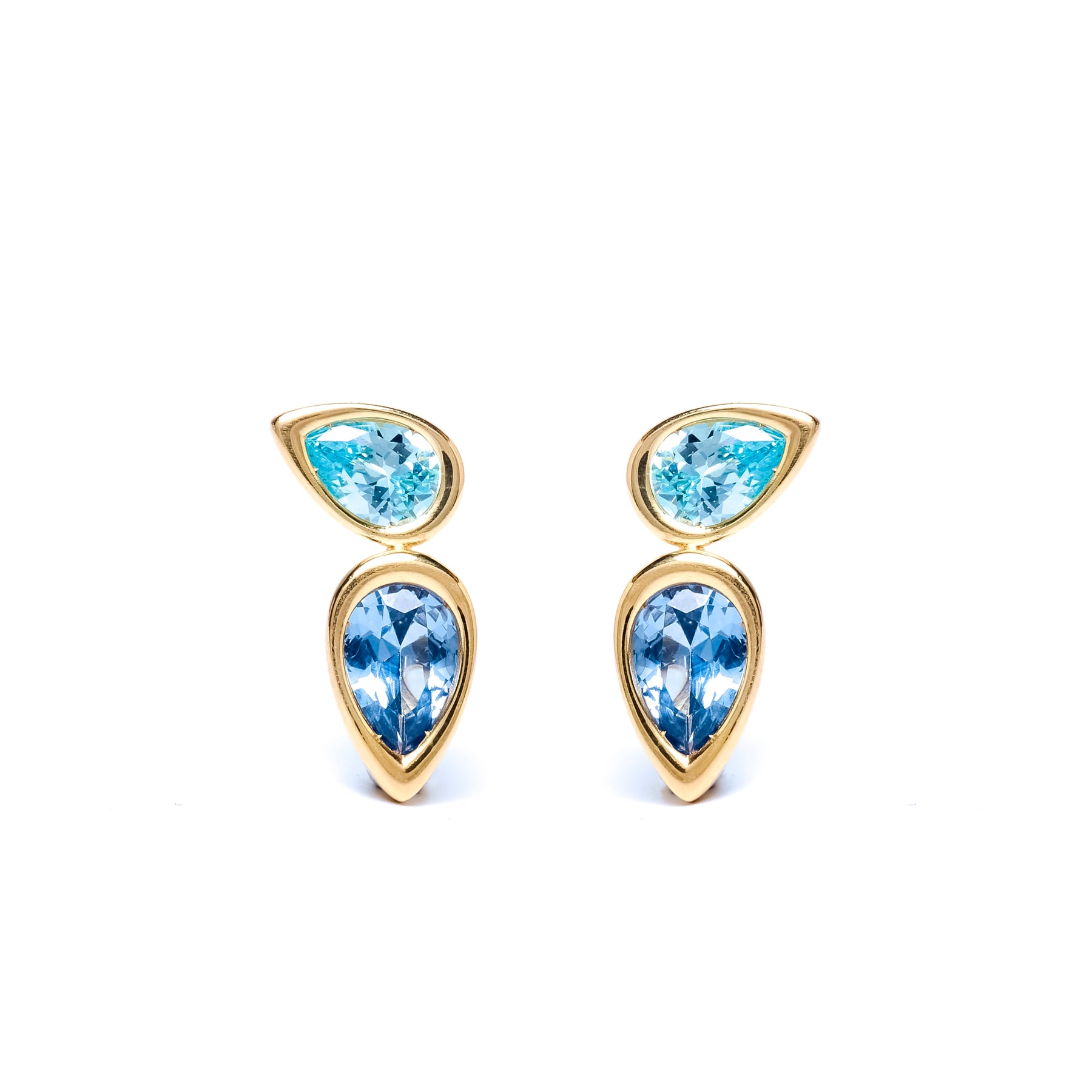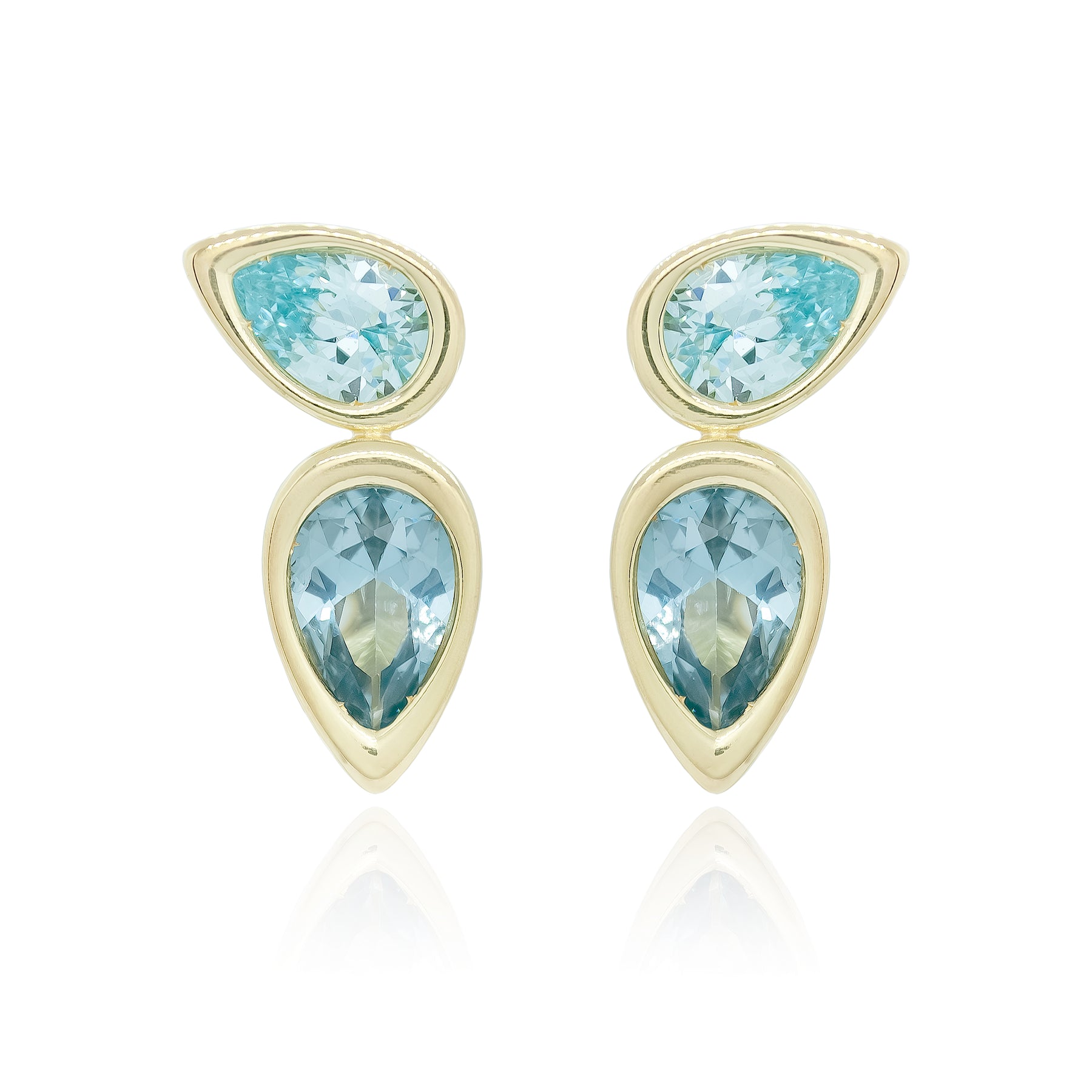 Blue Two Stone Pear Bud Earrings are made in 14k yellow gold. The earrings are set with pear shaped sky blue and london blue topaz.