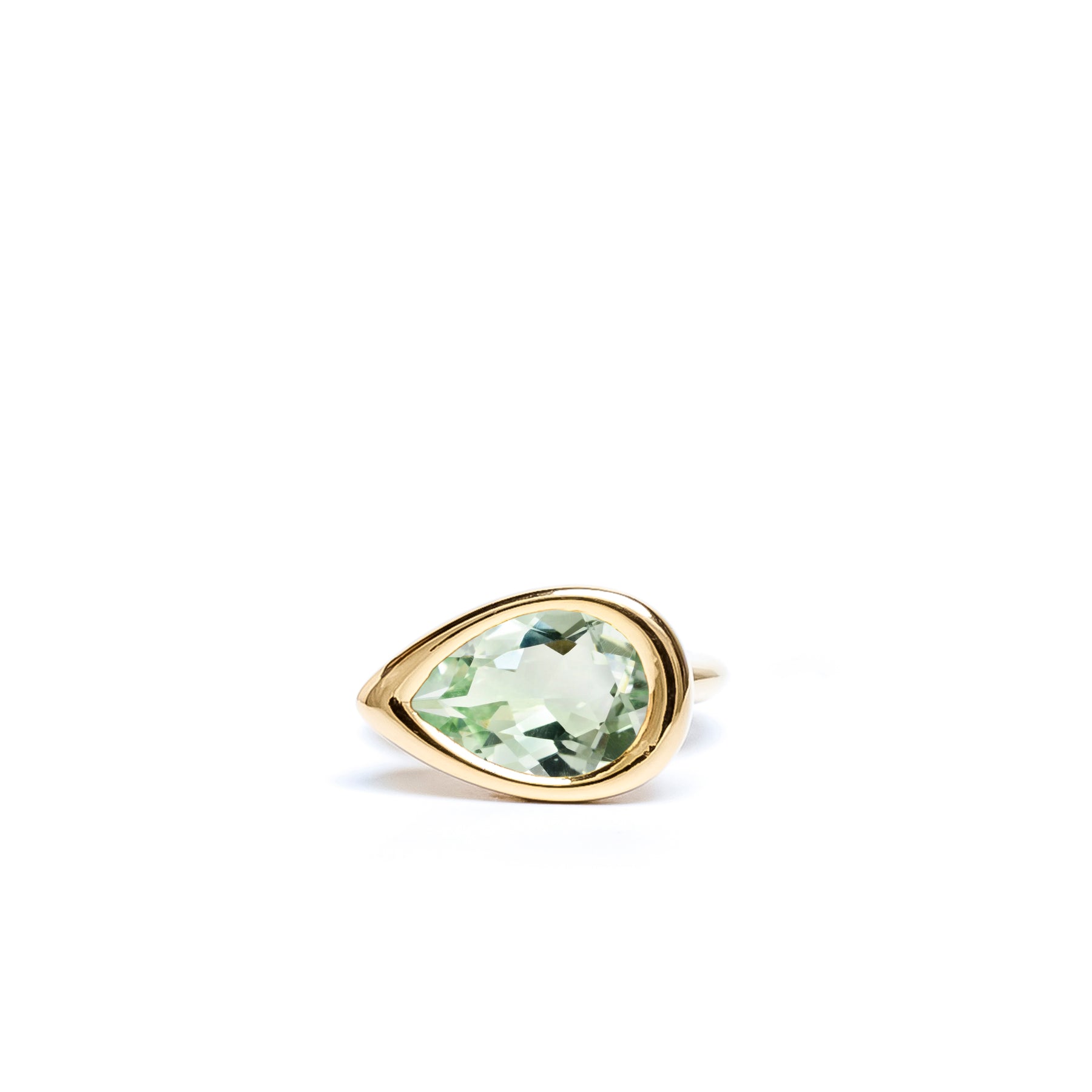 Green Quartz Pear Bud Ring is made in 14k yellow gold. The ring is set with a pear shaped, mint green quartz.