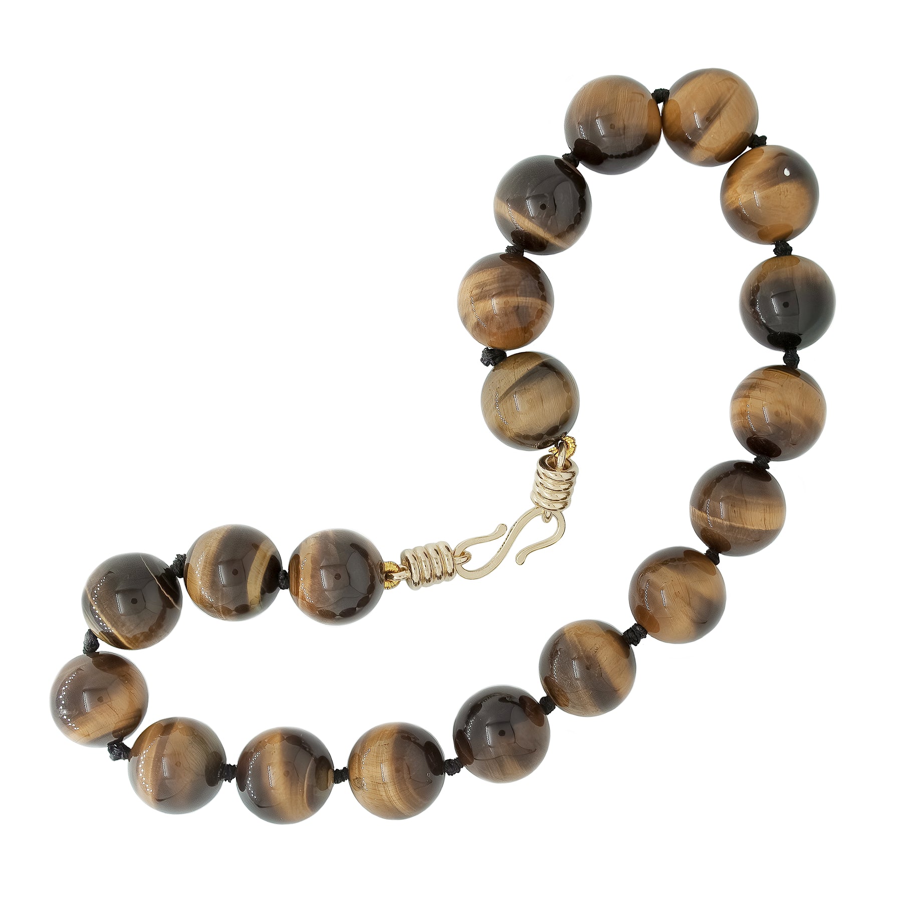 Tiger's Eye Strand Necklace is made in 14k yellow gold, and tiger's eye beads. The necklace is strung with black thread and 18 mm tiger's eye beads. The clasp is a custom ORMAN design which makes the design versatile as it can be connected to other chains and necklace.