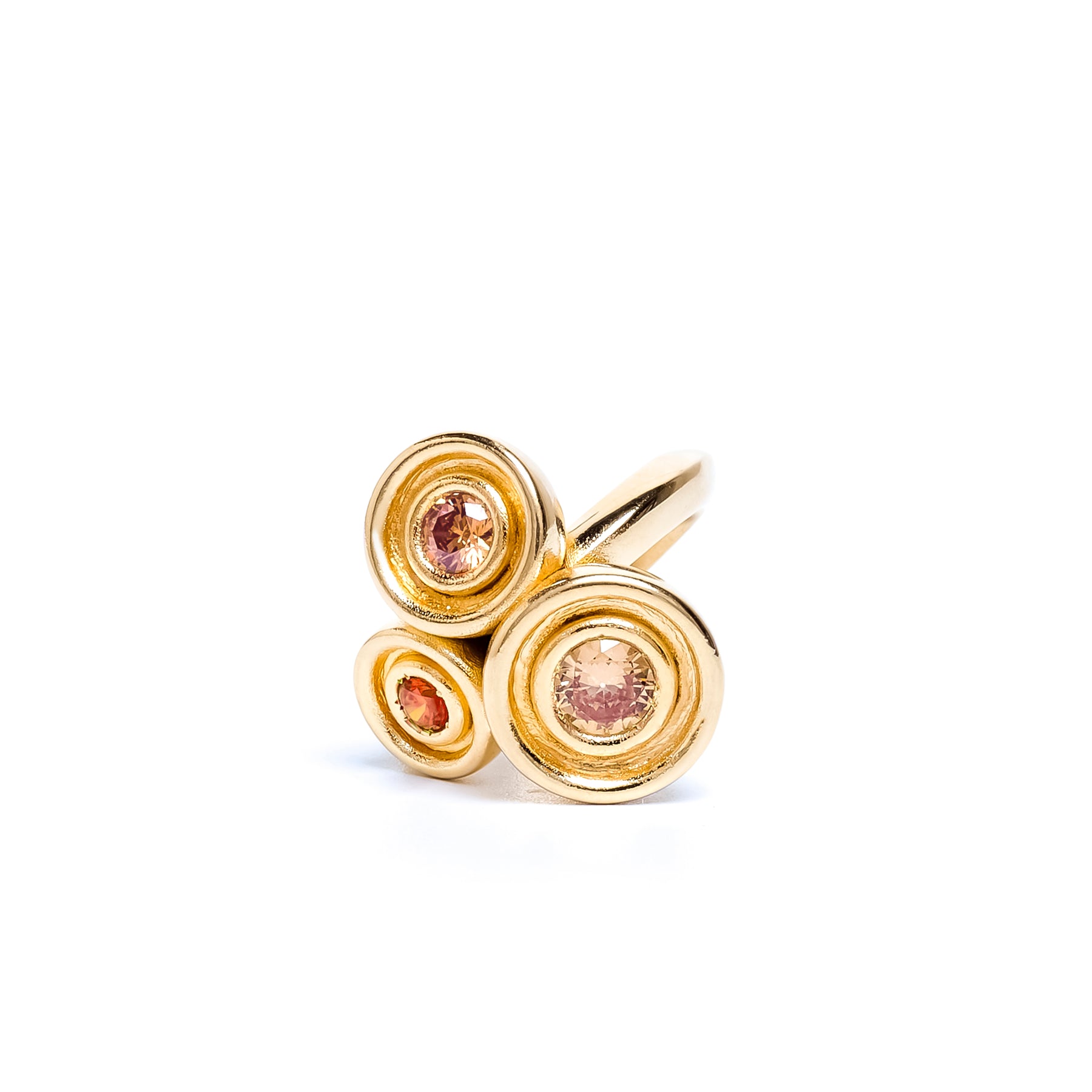 Champagne Three Stone Flora Ring is made in 14k yellow gold. The ring is set with champagne diamond, morganite and sapphire.