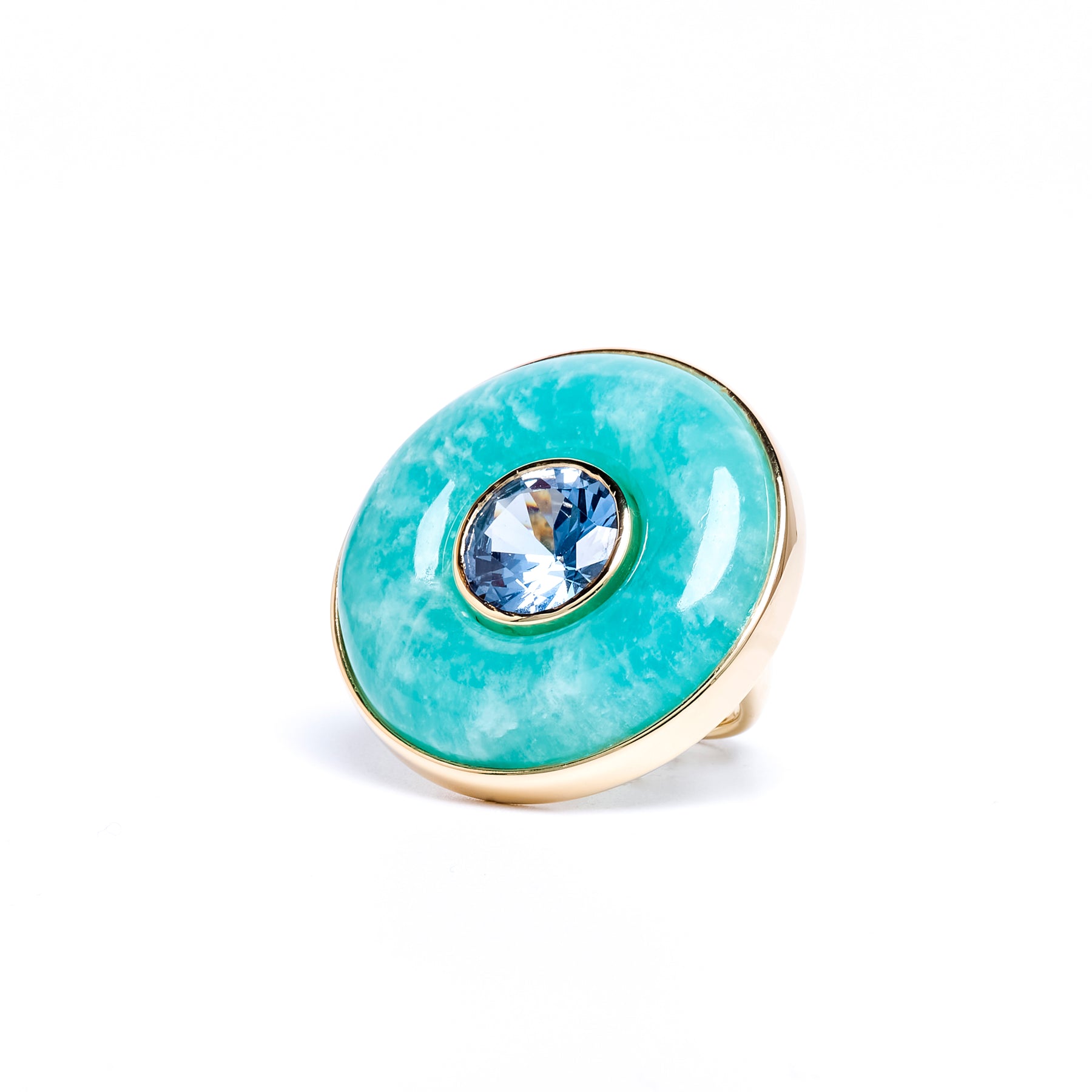 Ripples Blue Topaz Ring is made in 14k yellow gold, set with a london blue topaz, surrounded by hand carved amazonite.