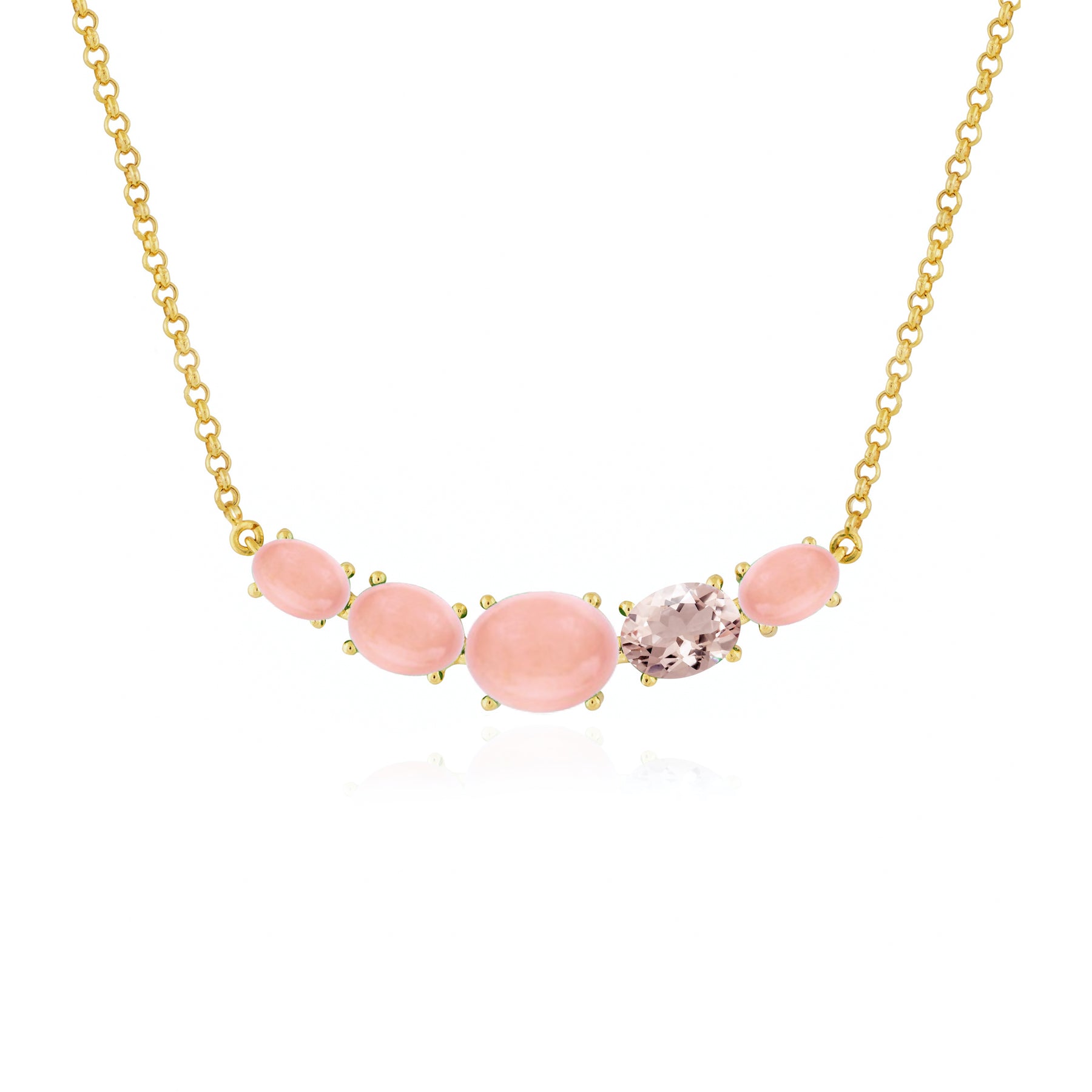 Beam Pink Coral Necklace is made in 14k yellow gold. The necklace is set with pink coral cabochons and one faceted morganite.